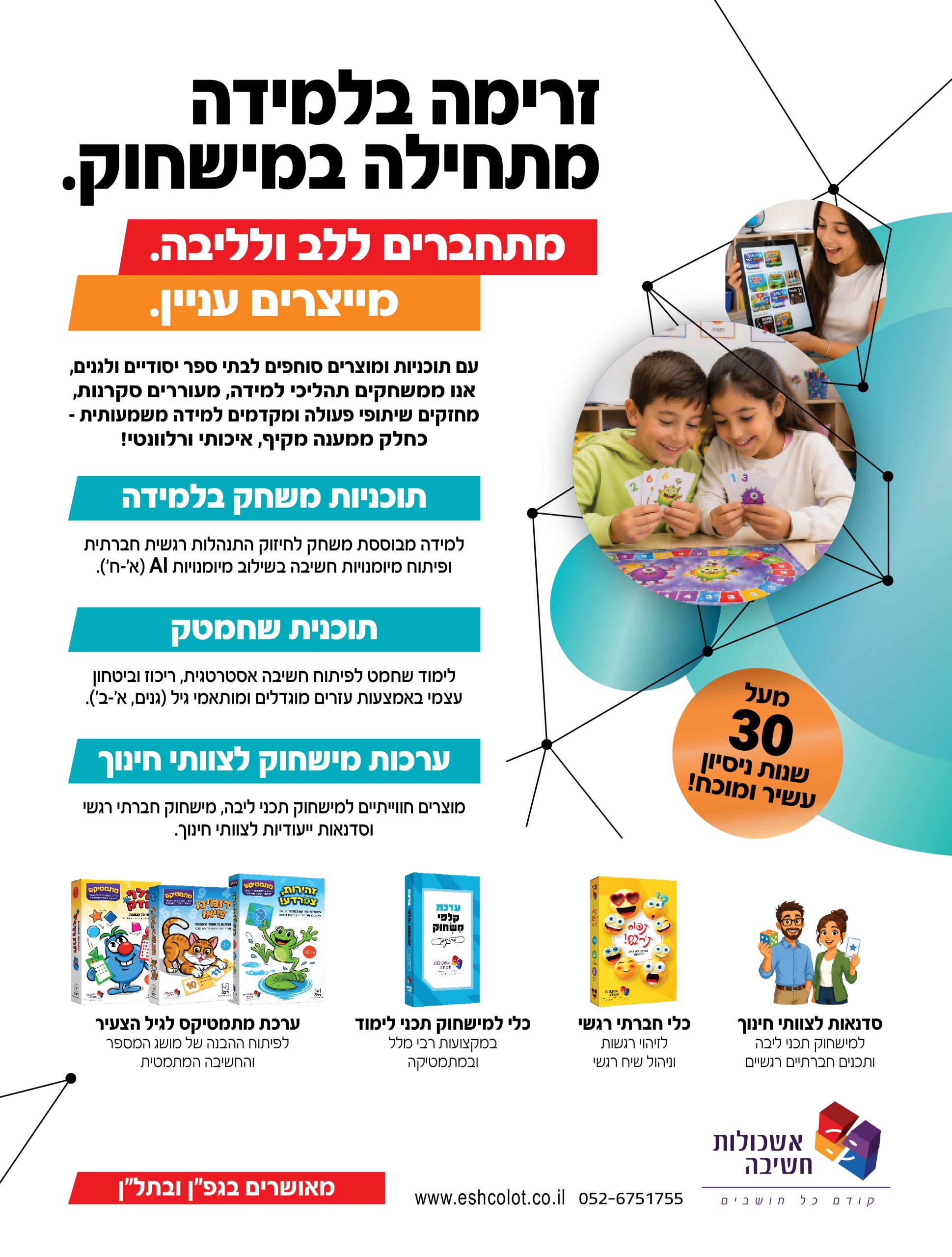 שילוב חדשנות חינוכית עם הנאה אמיתית בלמידה באמצעות מוצרים ייחודיים לבתי ספר יסודיים ולגני ילדים, שמקדמים למידה חווייתית, סקרנות, שיתוף פעולה וצמיחה אישית - ומעניקים לצוות החינוכי כלים מעשיים למישחוק הלמידה.